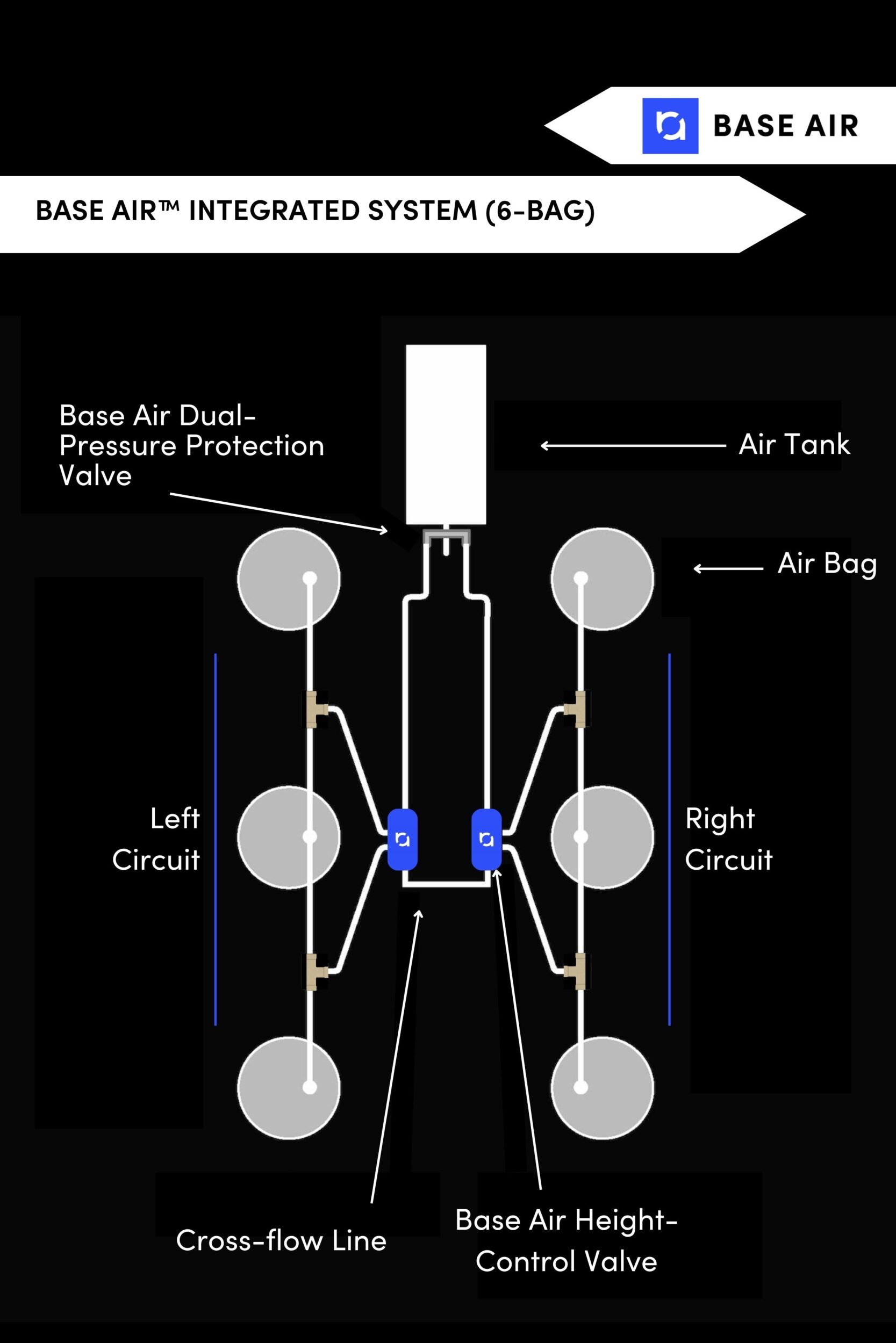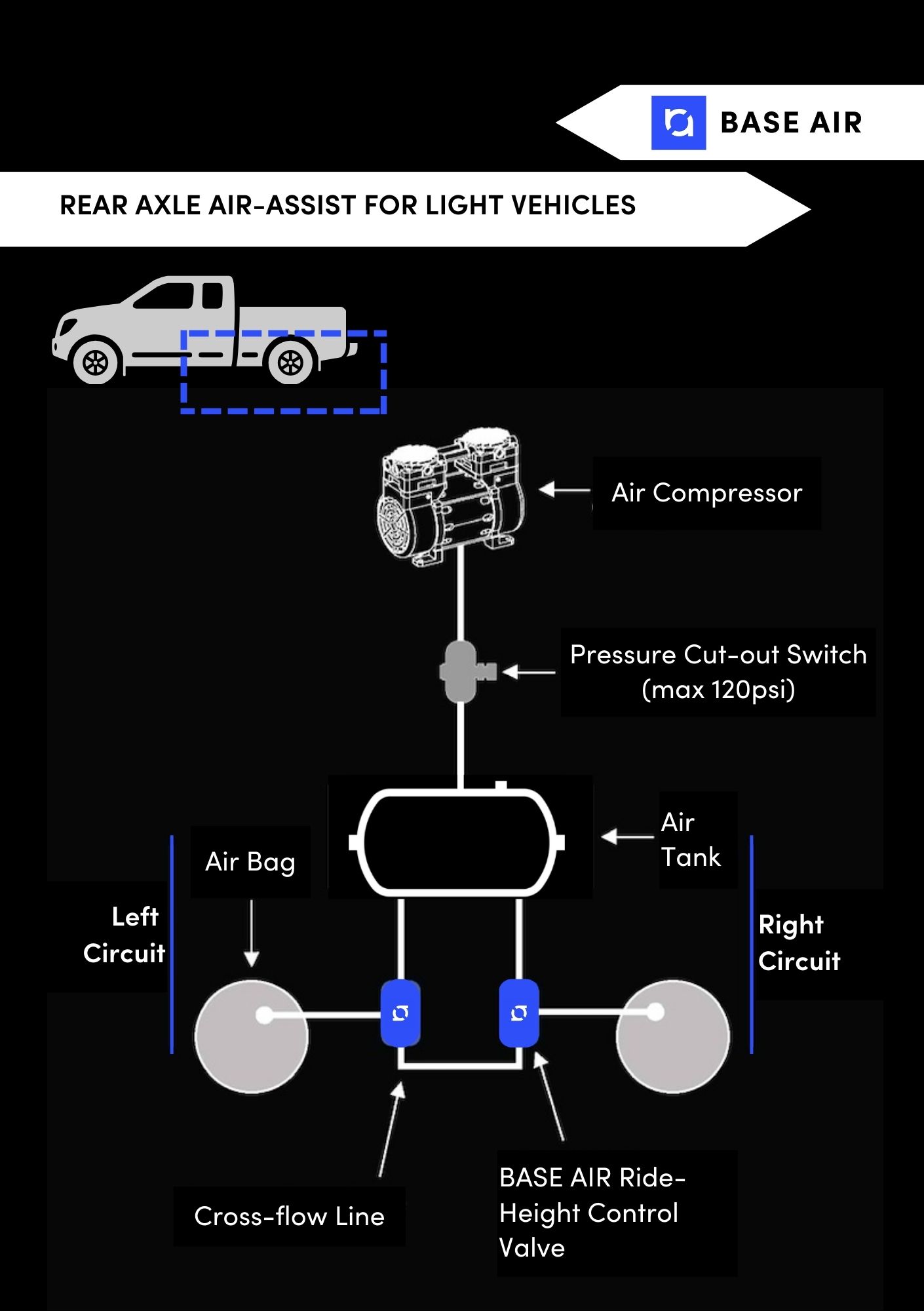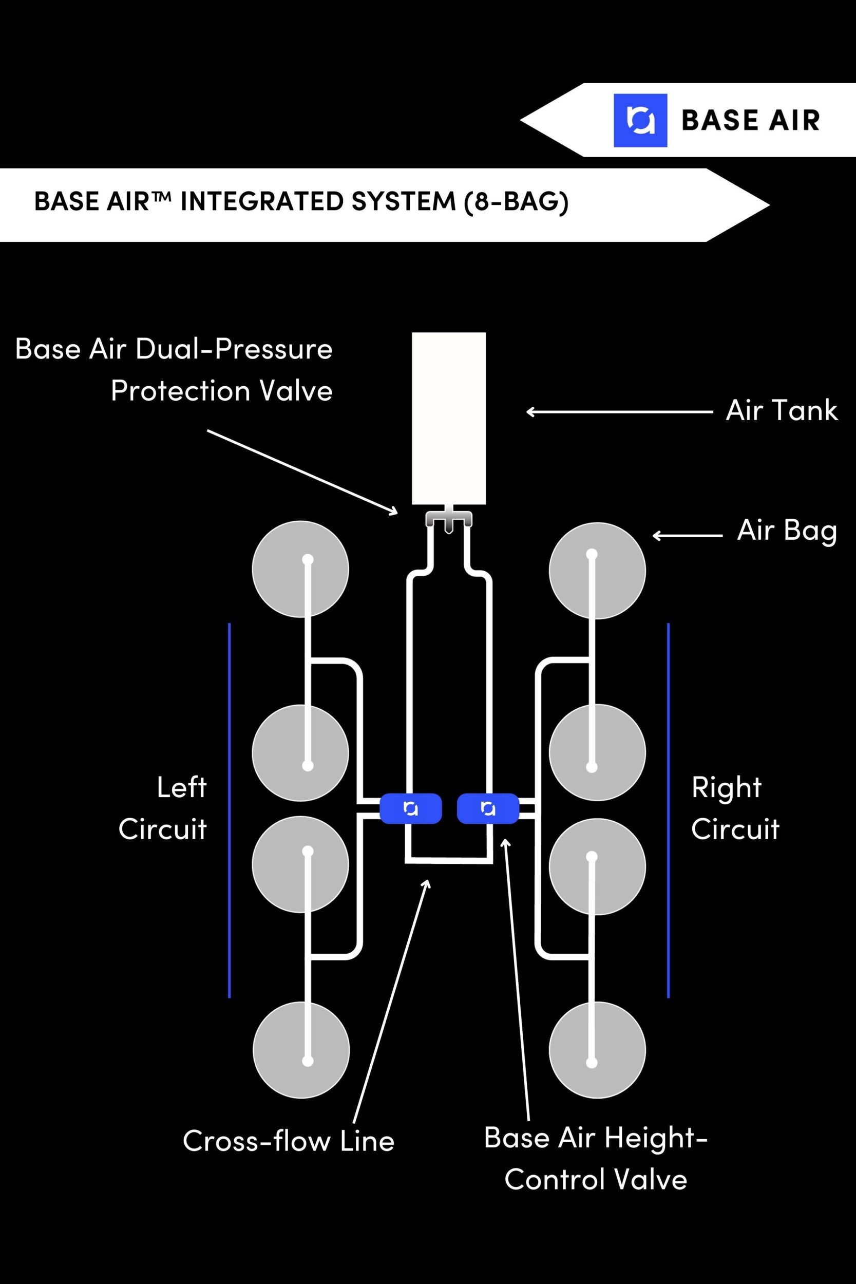 Base Air actively and mechanically adjusts vehicle suspensions—in real time—in response to changing vehicle dynamic driving conditions (i.e., offset weight, weight shift, load changes, body roll, axle input, braking, accelerating, etc.).